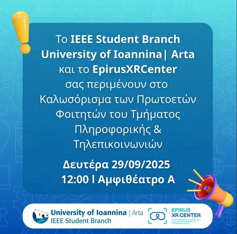 Τη Δευτέρα 29/9 και ώρα 12:00, το Τμήμα Πληροφορικής & Τηλεπικοινωνιών του Πανεπιστημίου Ιωαννίνων διοργανώνει την εκδήλωση υποδοχής των νέων φοιτητών. Μετά το καλωσόρισμα από το Τμήμα, το IEEE Student Branch University of Ioannina – Arta & το EpirusXRCenter Student Team θα παρουσιάσουν τις δράσεις και τις ευκαιρίες που προσφέρει, δίνοντάς σας τη δυνατότητα να […]