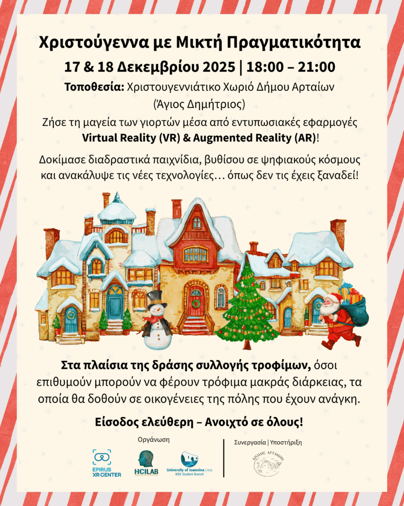 Το EpirusXRCenter & το IEEE Student Branch University of Ioannina | Arta σε συνεργασία με τον Δήμο Αρταίων, προσκαλούν μικρούς και μεγάλους σε μια ξεχωριστή γιορτινή δράση στο Χριστουγεννιάτικο Χωριό του Δήμου Αρταίων στον Άγιο Δημήτριο. Στις 17 & 18 Δεκεμβρίου 2025, από τις 18:00 έως τις 21:00, το κοινό θα έχει την ευκαιρία να […]