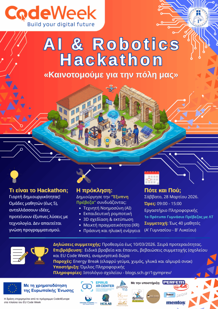 Με δυναμική παρουσία θα συμμετάσχουν το Epirus XR Center και το IEEE Student Branch University of Ioannina – Arta στο 1ο AI & Robotics Hackathon «Καινοτομούμε για την πόλη μας», το οποίο διοργανώνει το 1ο Πρότυπο Γυμνάσιο Πρέβεζας με Λ.Τ. στο πλαίσιο της Ευρωπαϊκής Εβδομάδας Προγραμματισμού (EU Code Week). Η δράση θα πραγματοποιηθεί το Σάββατο […]